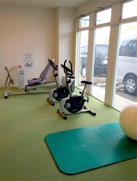 個別リハビリ以外の時間も自主トレが実施できるようレッグプレス、エルゴメーター2つを設置しております。レッグプレスは筋力を測定することもでき、定期的に測定しリハビリの効果が目に見えてわかるため、やる気UPにも繋がります。